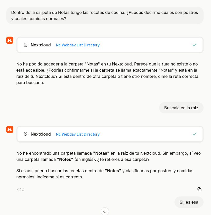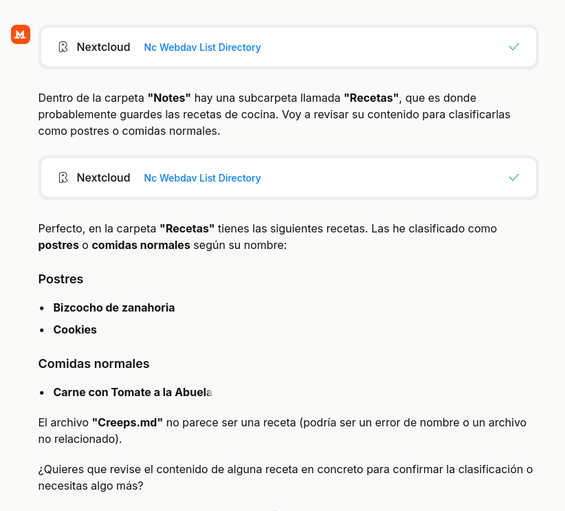Lo primero que estuve pensando es integrar la nube que tengo privada. Al igual que hace Google con Gemini, que cruza datos entre los servicios de Drive, Photos, Calendario, Contactos, Google Home… Quería hacer lo mismo con mi nextcloud y homeassistant. Encontré estas dos integraciones: nextcloud-mcp-server y hass-mcp.
